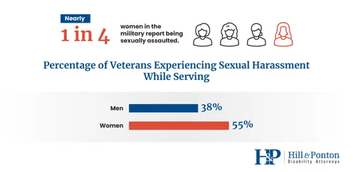 - Surprisingly, 23% of women in the military report being sexually assaulted, and 55% of female veterans and 38% of male veterans experienced sexual harassment while in the military.